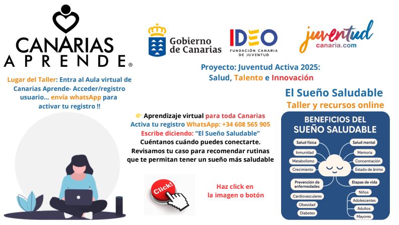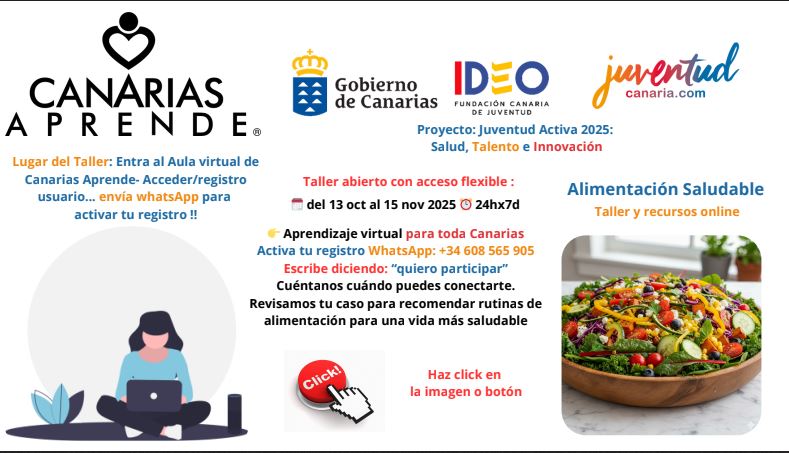 "Juventud Activa 2025: Salud, Talento e Innovación" es un proyecto educativo y participativo para jóvenes de toda Canarias Organizado por Canarias Aprende Con el apoyo de IDEO 2025. Este proyecto promueve hábitos de vida saludables, impulsa el talento juvenil y fomenta la creación de proyectos digitales innovadores a través del aula virtual de Moodle.