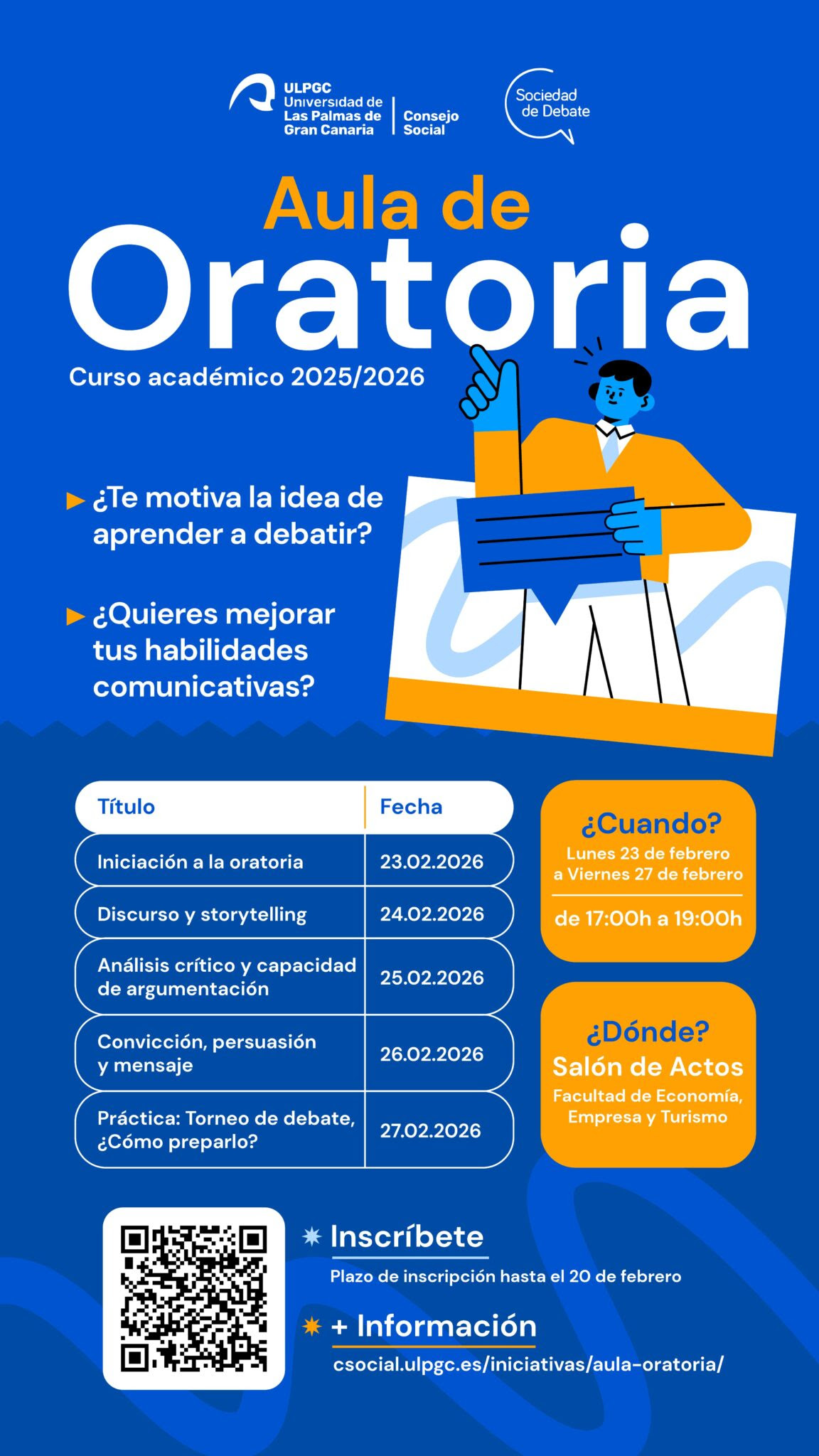 Para ello, la Sociedad de Debate ha programado para la última semana del mes de febrero cinco sesiones, en horario de tarde, con un total de 10 horas de duración, a impartir en el Salón de Actos de la Facultad de Economía, Empresa y Turismo.