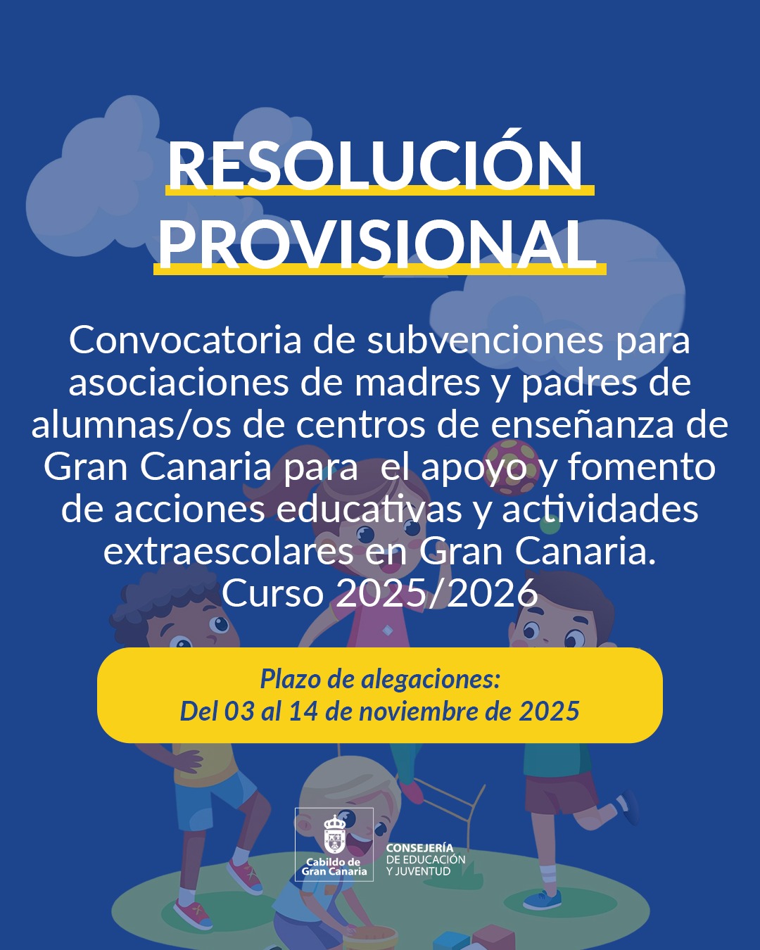 Resolución provisional de la convocatoria de subvenciones para asociaciones de madres y padres de alumnas y alumnos de centros de enseñanza de Gran Canaria para el apoyo y fomento de acciones educativas y actividades extraescolares, curso 2025/2026.