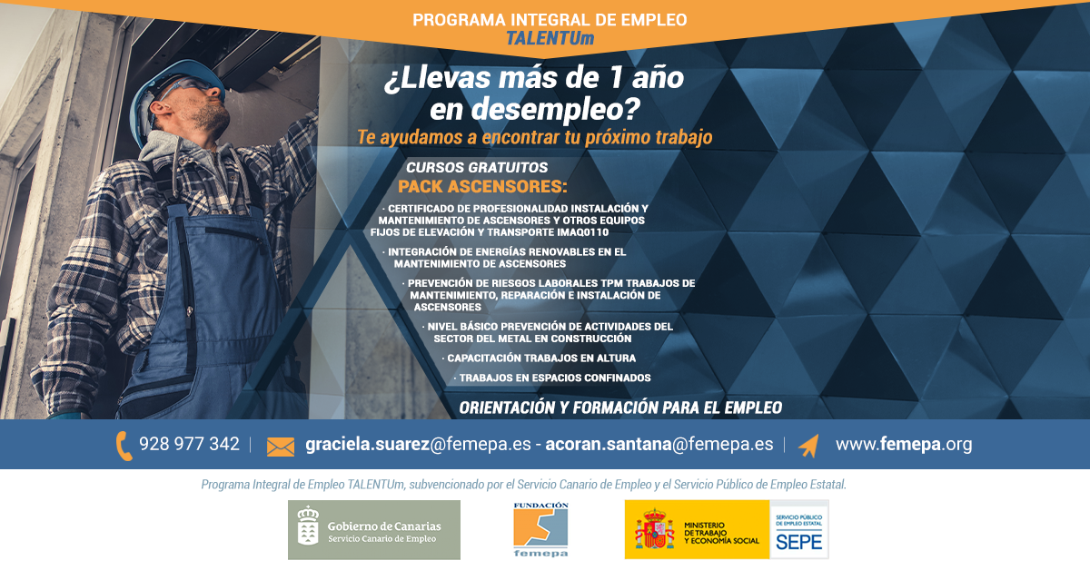 Pueden inscribirse a través de la web de formación del Femepa al curso de ascensores o por la web de Femepa en la sección de Talentum https://femepa.org/web/talentum/