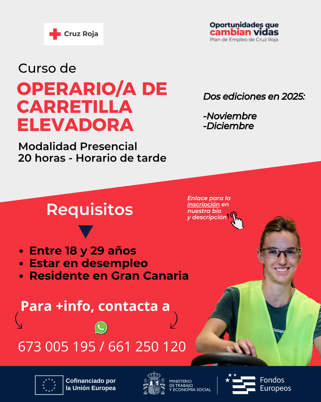• Carretilla elevadora (de 18 a 29 años) presencial en horario de 15 a 20 h  INICIO EL 20 de octubre  20 horas.