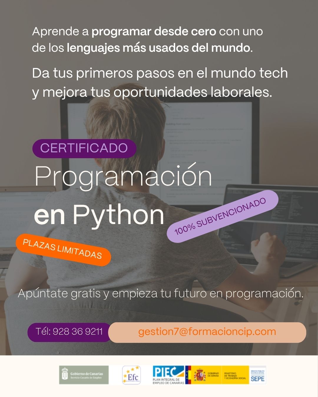 Desde Centro Internacional Politécnico, centro colaborador del Servicio Canario de Empleo le informamos sobre la especialidad de "PROGRAMACIÓN EN PYTHON", una formación 100% práctica que te permitirá adquirir una de las competencias más demandadas por las empresas.