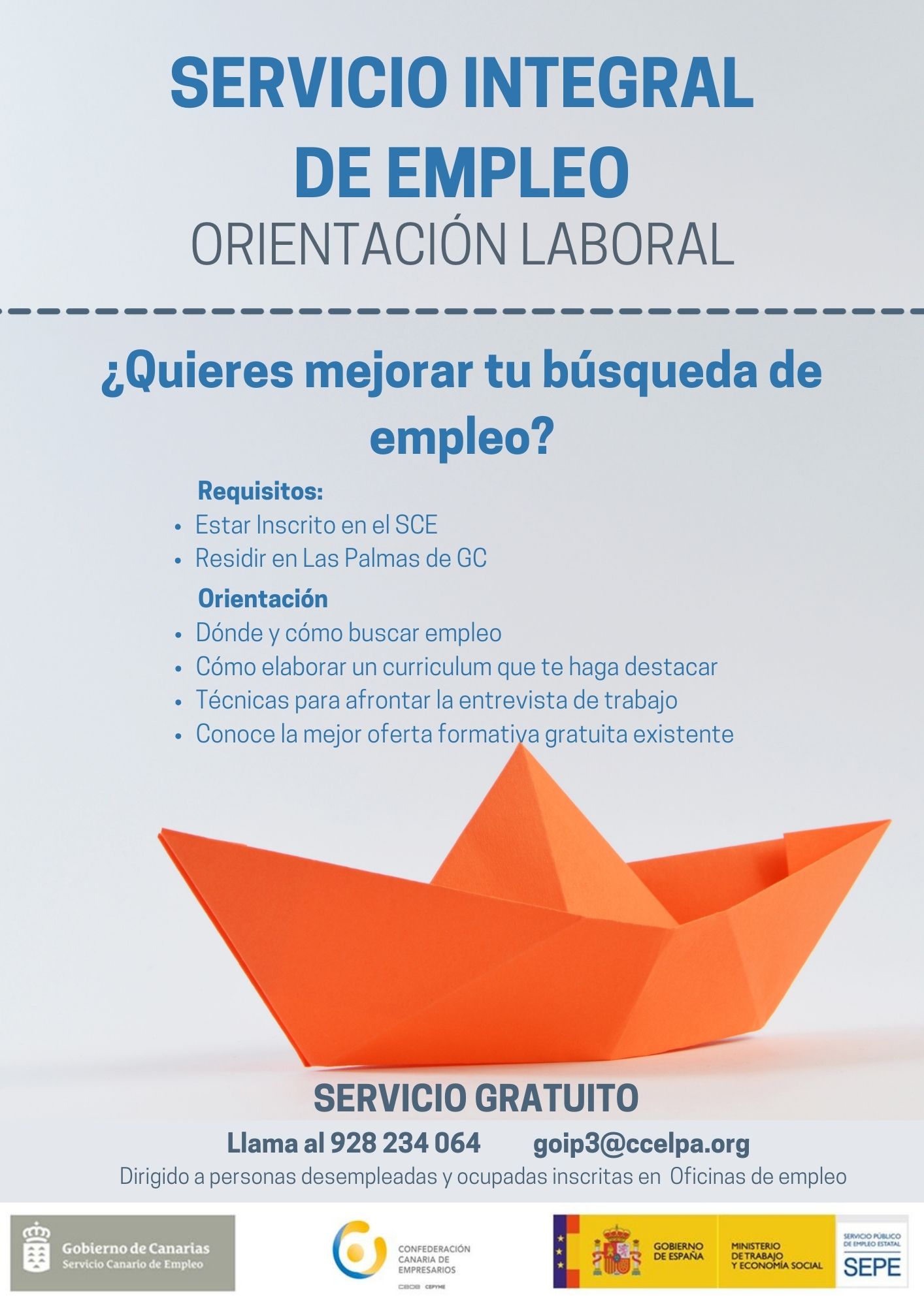 La Confederación Canaria de Empresarios, a través del SIE (Servicio Integral de Empleo) y su área de Orientación Laboral, ofrece a personas desempleadas y ocupadas, inscritas en el SCE, herramientas personales, sociales y laborales para definir su objetivo profesional y avanzar hacia él. El servicio incluye asesoramiento formativo y la elaboración de un itinerario personalizado de empleo, con un seguimiento continuo de los avances logrados.