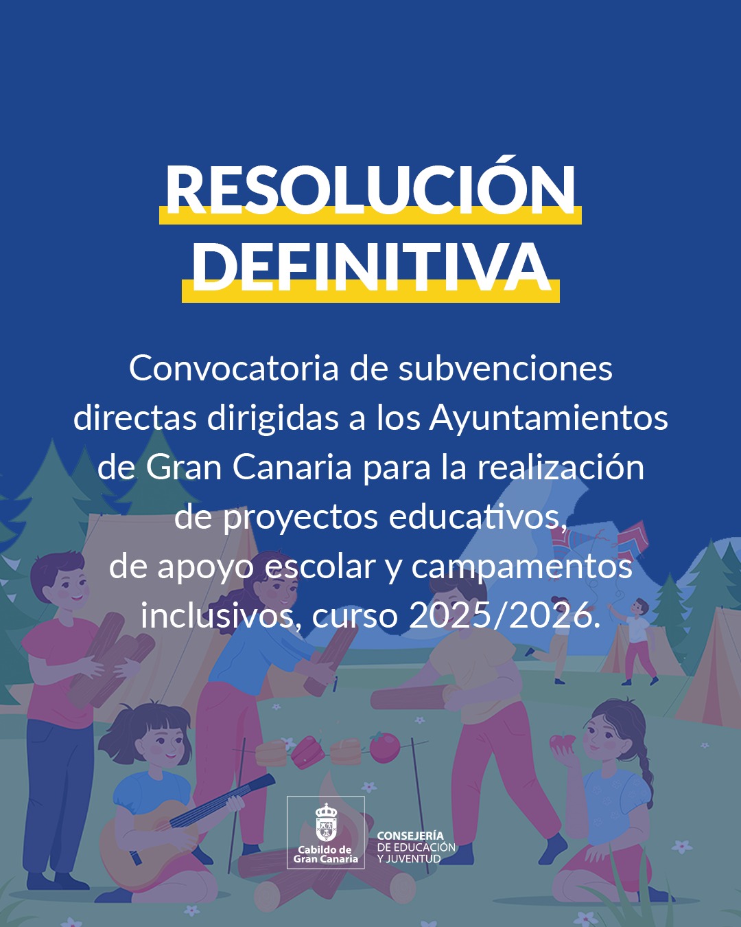 4. Resolución definitiva para la concesión de subvenciones directas dirigidas a los ayuntamientos de Gran Canaria para la realización de proyectos educativos, apoyo escolar y campamentos inclusivos 2025-2006. (publicado el 14 de noviembre de 2025).